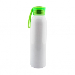 Botella en aluminio con tapa rosca plástica y manija plástica incorporada para transporte. Capacidad 650ml. Temperatura recomendada de 10 °C a 100 °C.