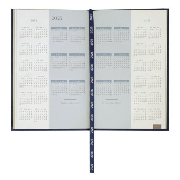 Agenda diaria con 186 hojas. Contiene datos personales, calendarios 2024-2025-2026, planeador 2025, seguimiento de nuevos hábitos, organizador de tareas y planeador de proyecto. Incluye caja individual del mismo color a la agenda.
