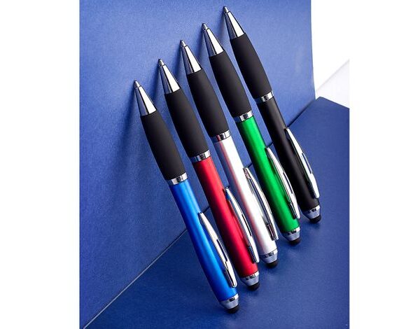 Bolígrafo con acabado mate, clip y punta plateada, con stylus en la parte superior y tapa.