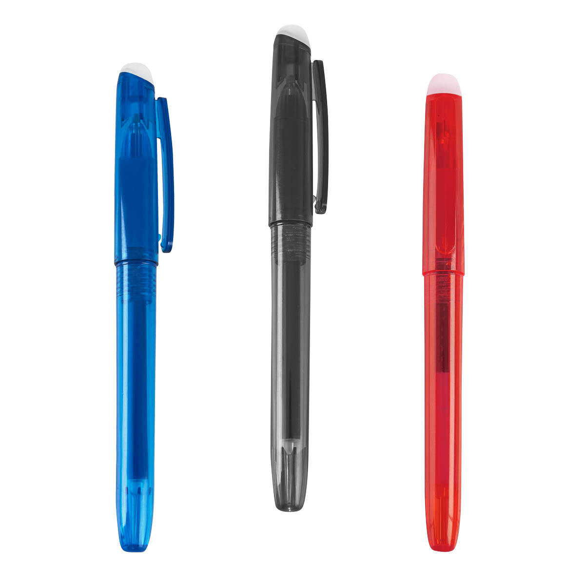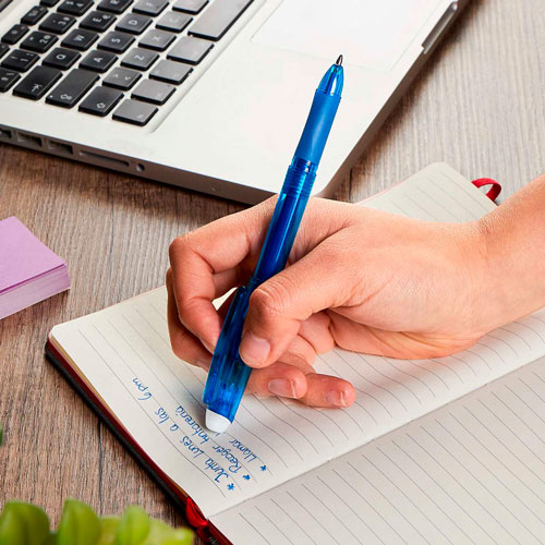 Descripción: Bolígrafo tinta gel térmico-sensitiva que se borra con la fricción de la goma, con tapón y grip antiderrapante.
