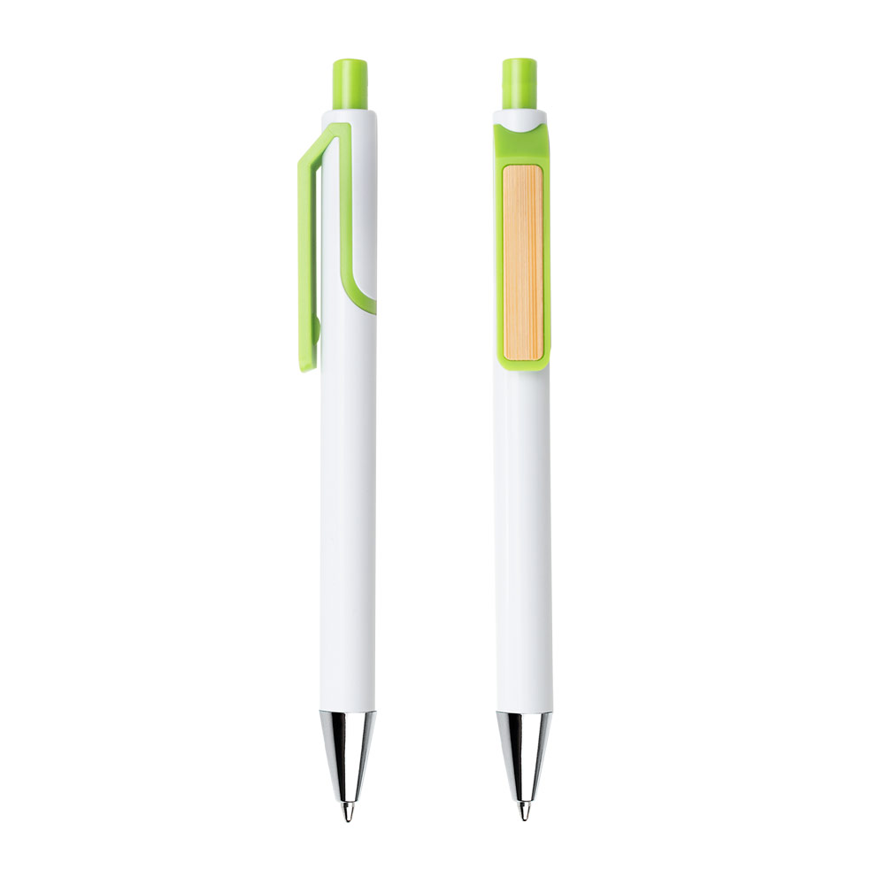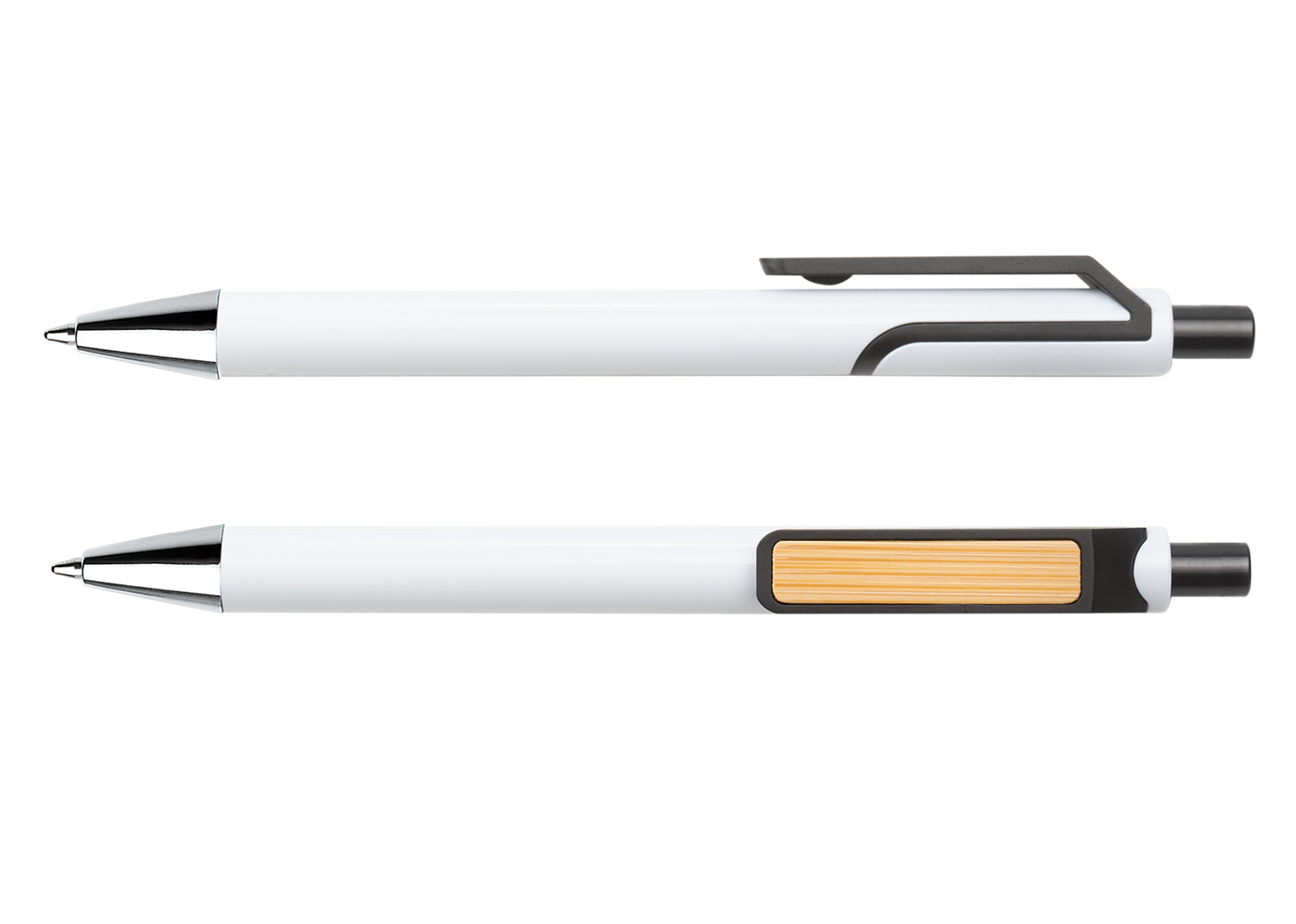 Bolígrafo plástico con sistema retráctil. Clip en Bambú que puede ser usado para la marca.