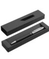 Metálico. Cuerpo color negro mate. Puntera, clip y anillo metálico. Apertura giratoria. En la parte superior destape electroplateado. Parte inferior texturada para mejor agarre. Tinta negra. Recarga metálica. Presentación en caja de regalo.