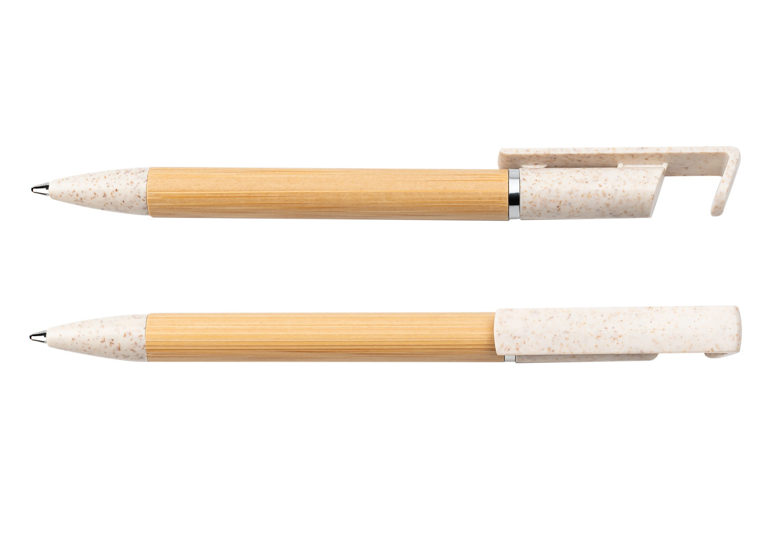 Bolígrafo ecológico que incluye un soporte para el celular. Sistema de apertura twist.