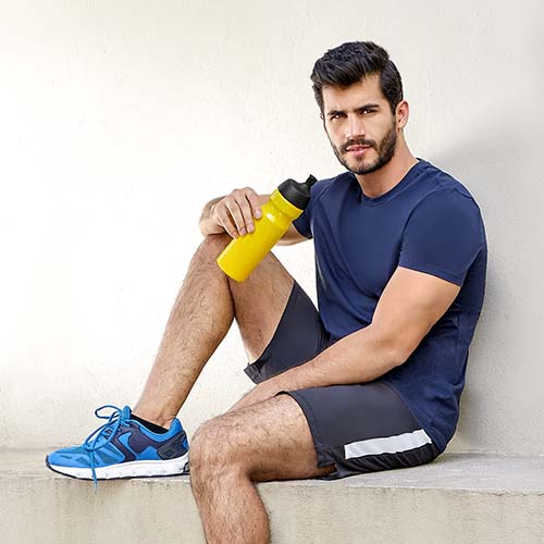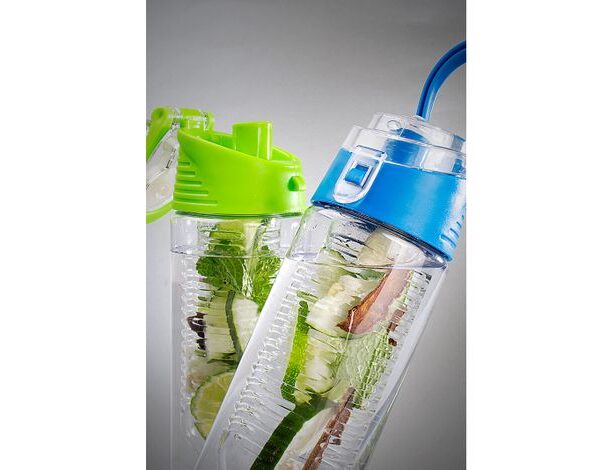 Botella deportiva con tapa a presión y agarradera para transportar fácil. Capacidad de 600ml.