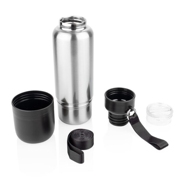 Botella de acero inoxidable de 500 ml (17 oz) con tapa de rosca hecha de bambú y cordón para un transporte sencillo. Un diseño simple pero encantador.