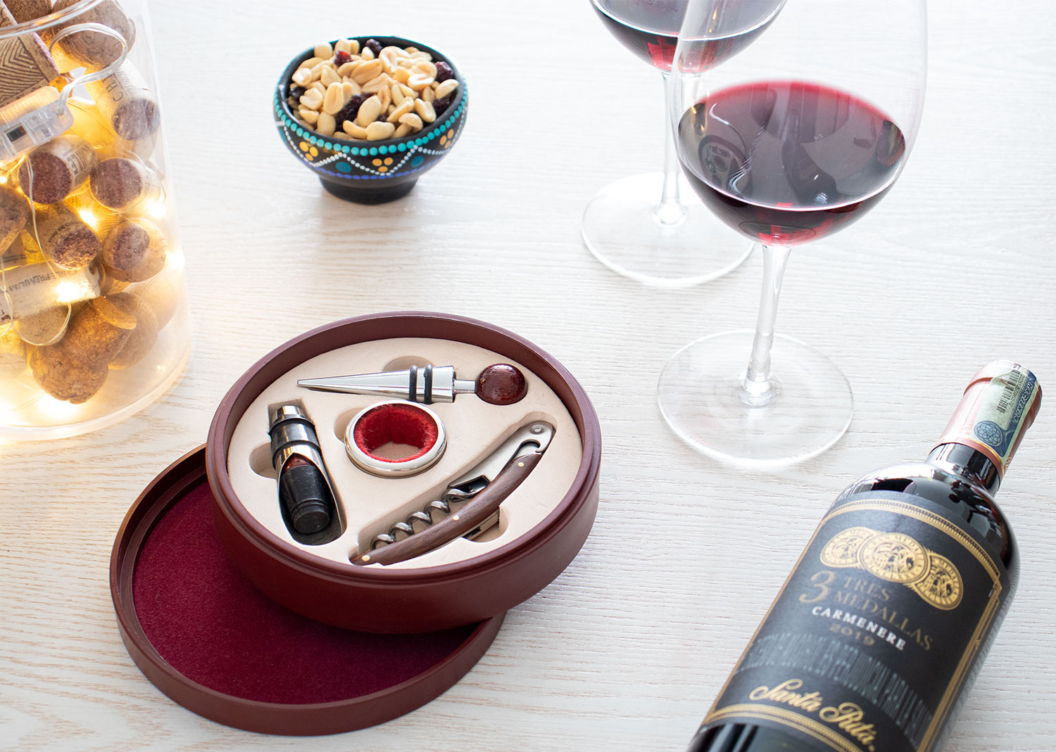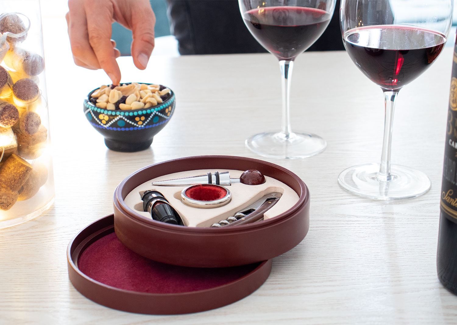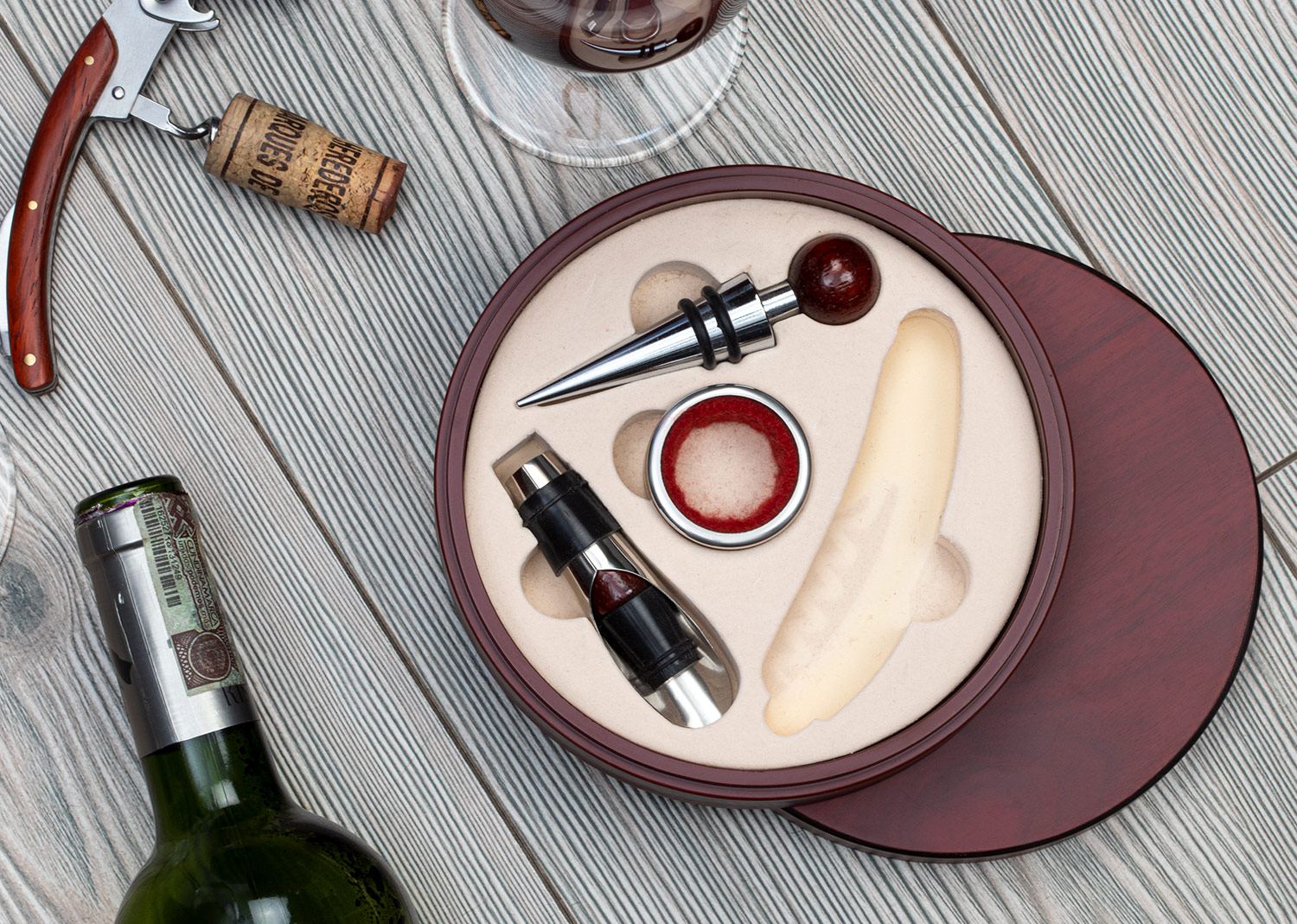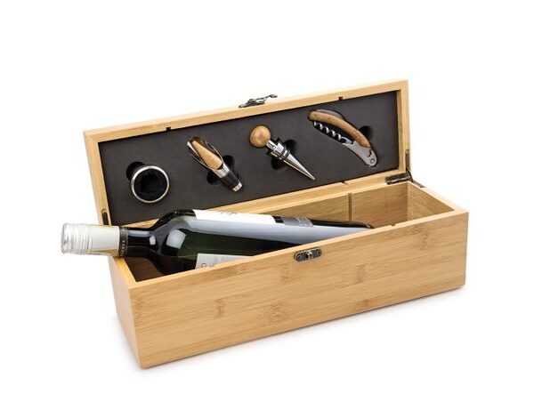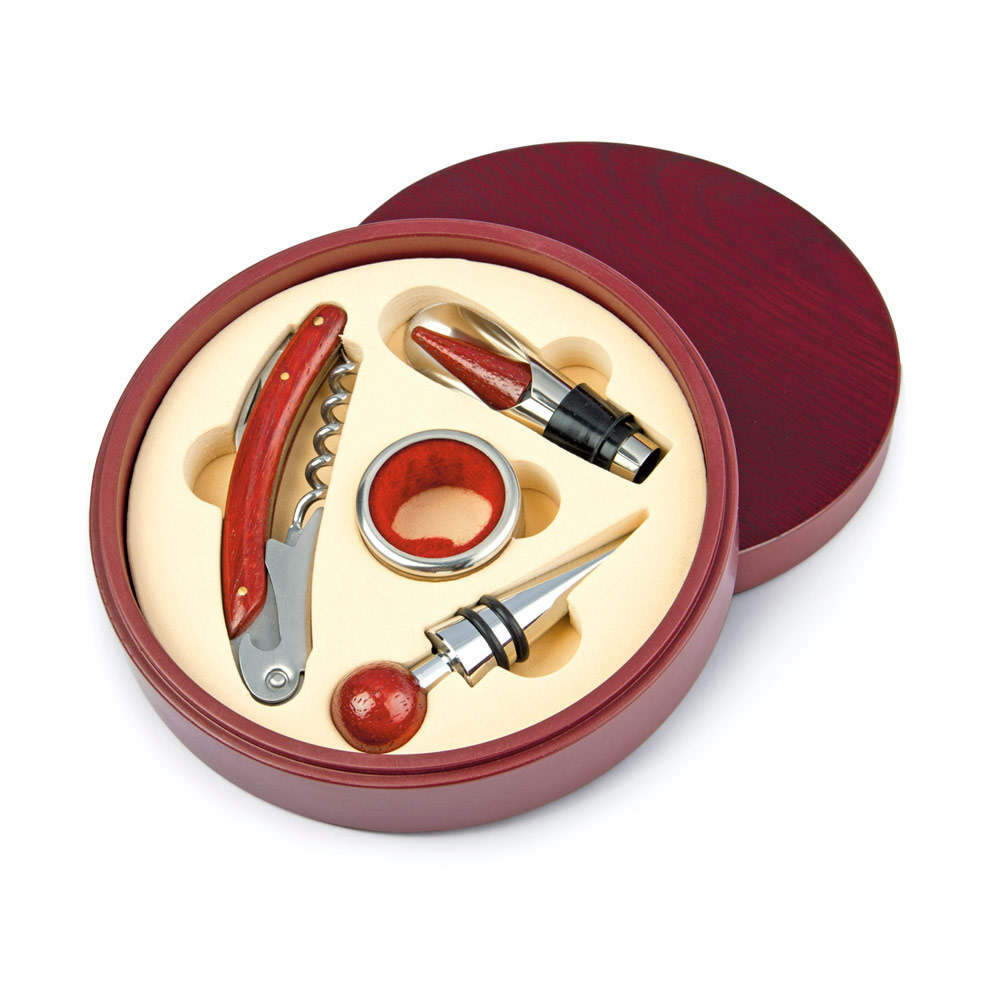 Contiene 4 accesorios con apliques en madera: Tapón para botella, cortagotas, aro antigoteo, sacacorchos de un tiempo. Caja circular de madera con interior beige.