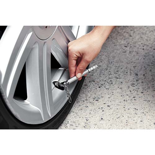 Calibrador de aire para llantas, con mango ergonómico y clip para bolsillo. Color traslúcido.