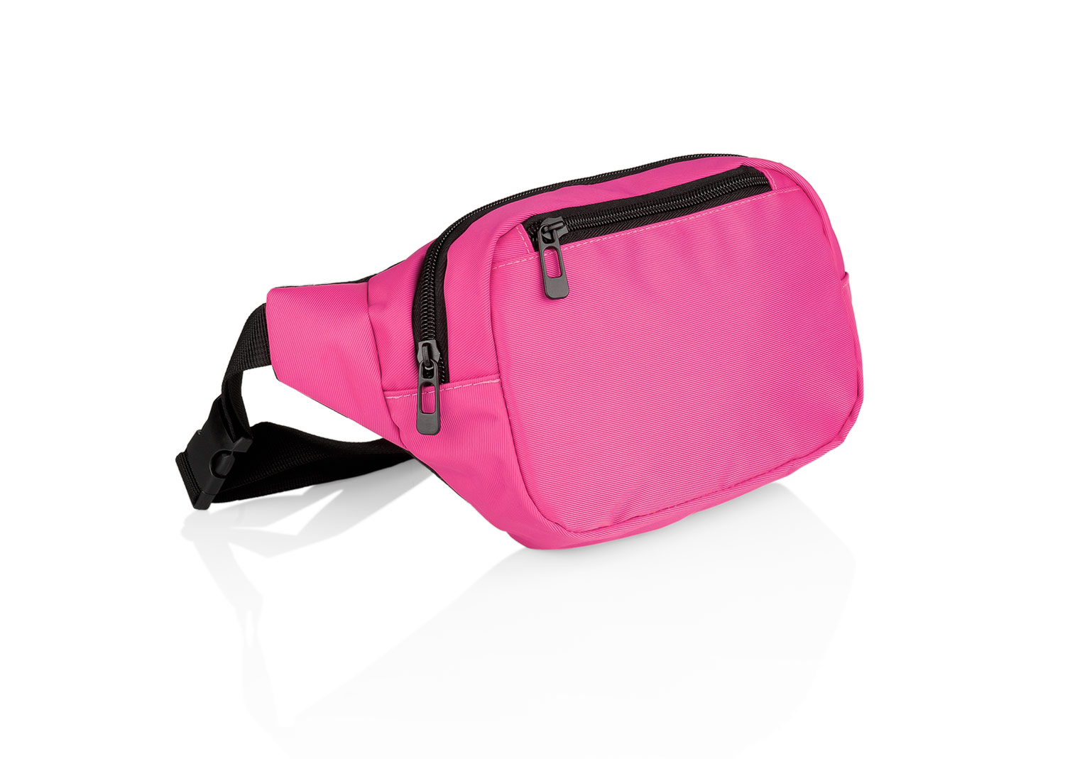 Canguro con bolsillo frontal y trasero con cremallera, y correa ajustable a la cintura con broche de hebilla.