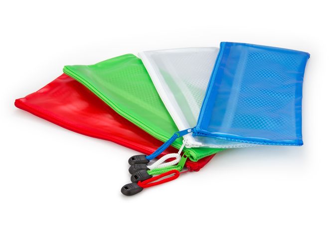 Cartuchera escolar plástica, con bolsillo separador en la parte interior de malla.