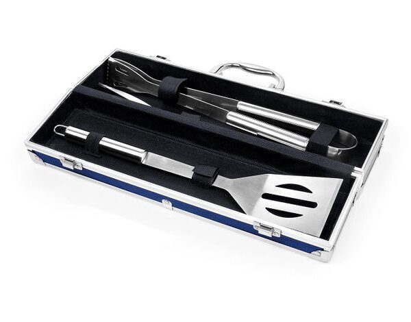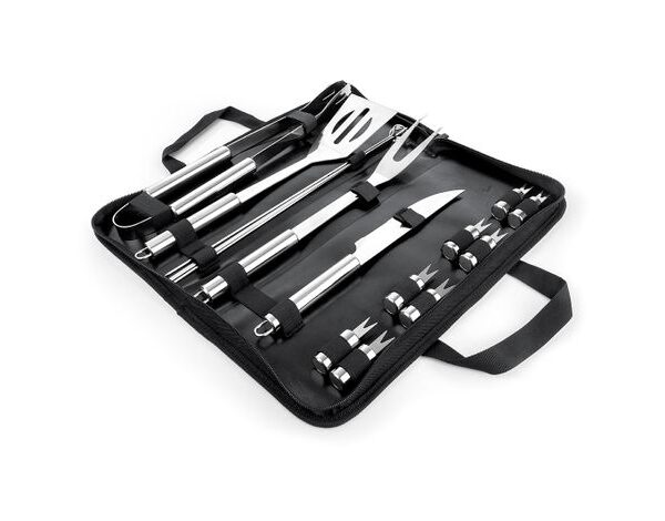 Set de BBQ compuesto por el estuche delantal con broches, correa ajustable y 7 utensilios: pinzas, espátula, trinche, cuchillo, guante, salero y pimentero.