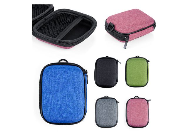 Estuche en EVA con cierre en cremallera, argolla exterior y bolsillos interiores en malla.