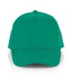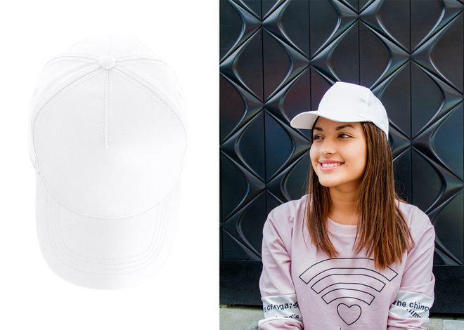 Gorra de 5 paneles con frente fusionado, visera indeformable 4 costuras, botón forrado, 4 ojetes bordados, tafilete textil y cierre velcro.