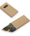 Estuche en cartón cilíndrico que contiene 12 colores de madera y tapa con tajalápiz.