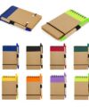 Set de libreta con 70 hojas blancas, 5 juegos de memos adhesivos en papel por 25 unidades c/u. de colores y bolígrafo. Tamaño aproximado: A6. Incluye porta bolígrafo.