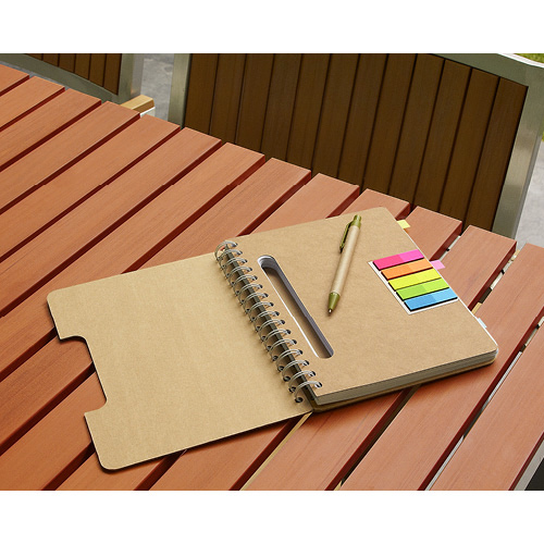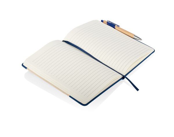 Libreta con cubierta en Bambú. Con banda elástica de cierre. Cinta marcadora. 80 hojas rayadas. Tamaño aproximado de la hoja: A5.