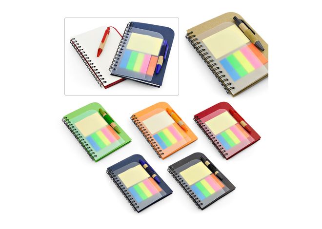 Libreta con cubierta en acetato grueso y cartón de colores, memo adhesivo por 25 und y 5 set de 25 banderitas PET adhesivas de colores y mini bolígrafo incluidos. 40 hojas blancas Tamaño aproximado de la hoja A6.