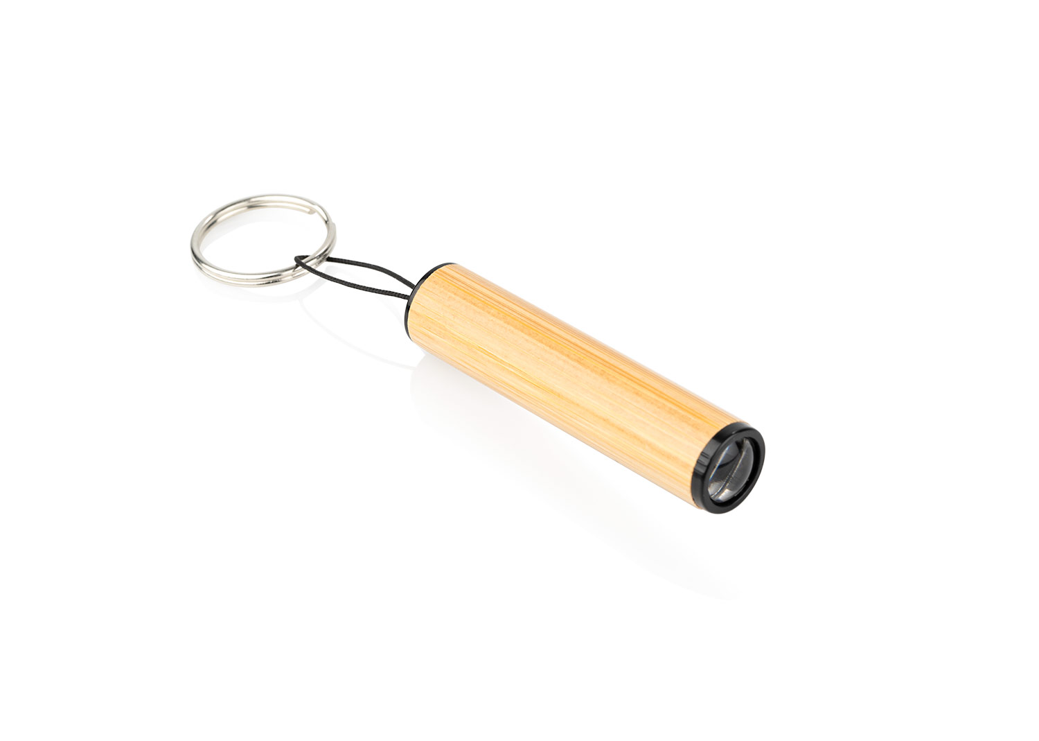 Mini linterna LED con revestimiento de bambú. Incluye aro para llaves.