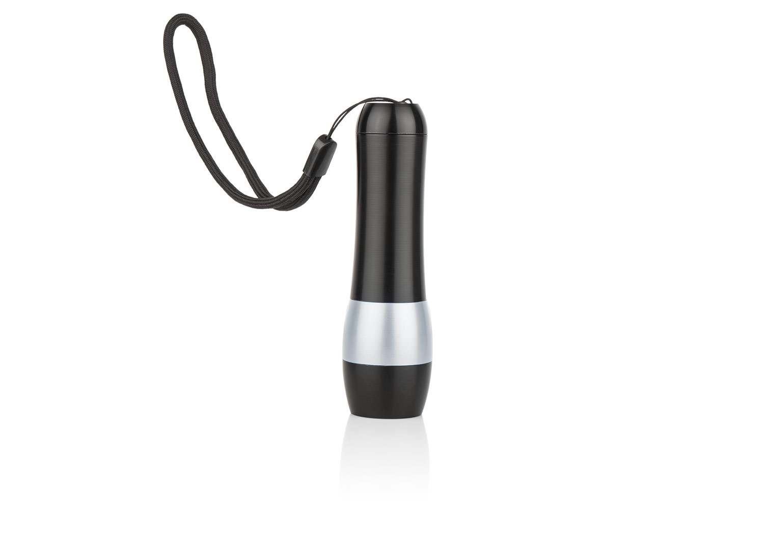 Linterna de aluminio con 9 LEDs. Requiere 3 pilas AAA (no incluidas). Correa negra para transportar fácilmente.