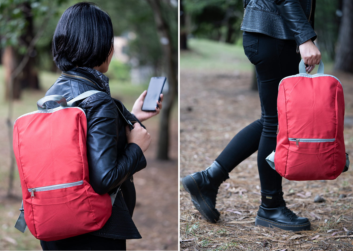 Morral con cargaderas ajustables, bolsillos principal y frontal con cremallera.