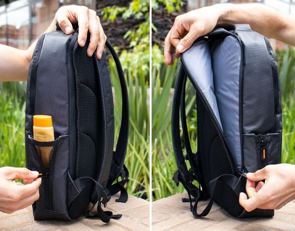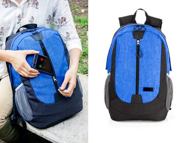 Morral con cargaderas ajustables, Bolsillos laterales en malla, bolsillos frontales y principal con cierre en cremallera, compartimiento para el portátil de 14″.