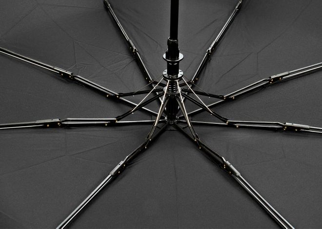 3 secciones, apertura automática y cierre manual, marco negro + 2 secciones de costillas negras en fibra de vidrio, 190t pongee, mango en goma. Paraguas a prueba de viento. Antibrisa. Incluye funda del mismo color del paraguas.