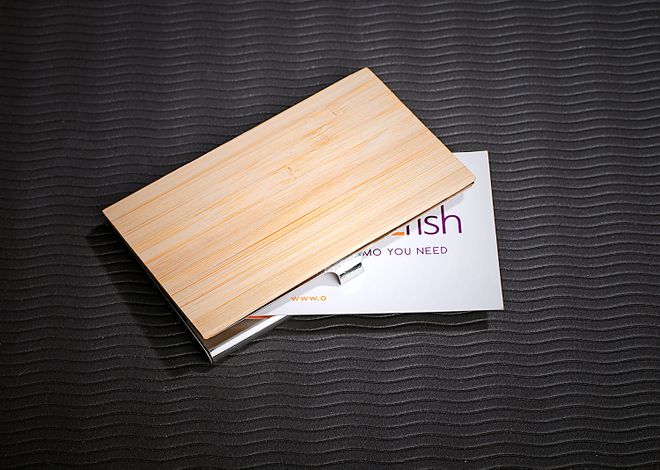 Portatarjeta Metalico con cubierta en Bambú, cierre a presion.