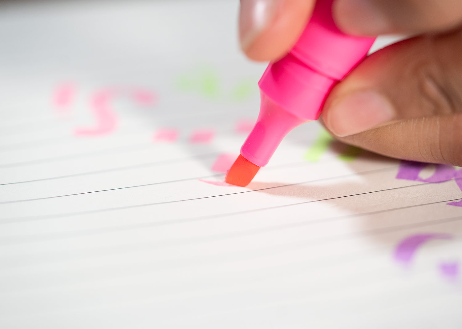 Resaltador plástico con cuerpo de color sólido con ribete transparente.