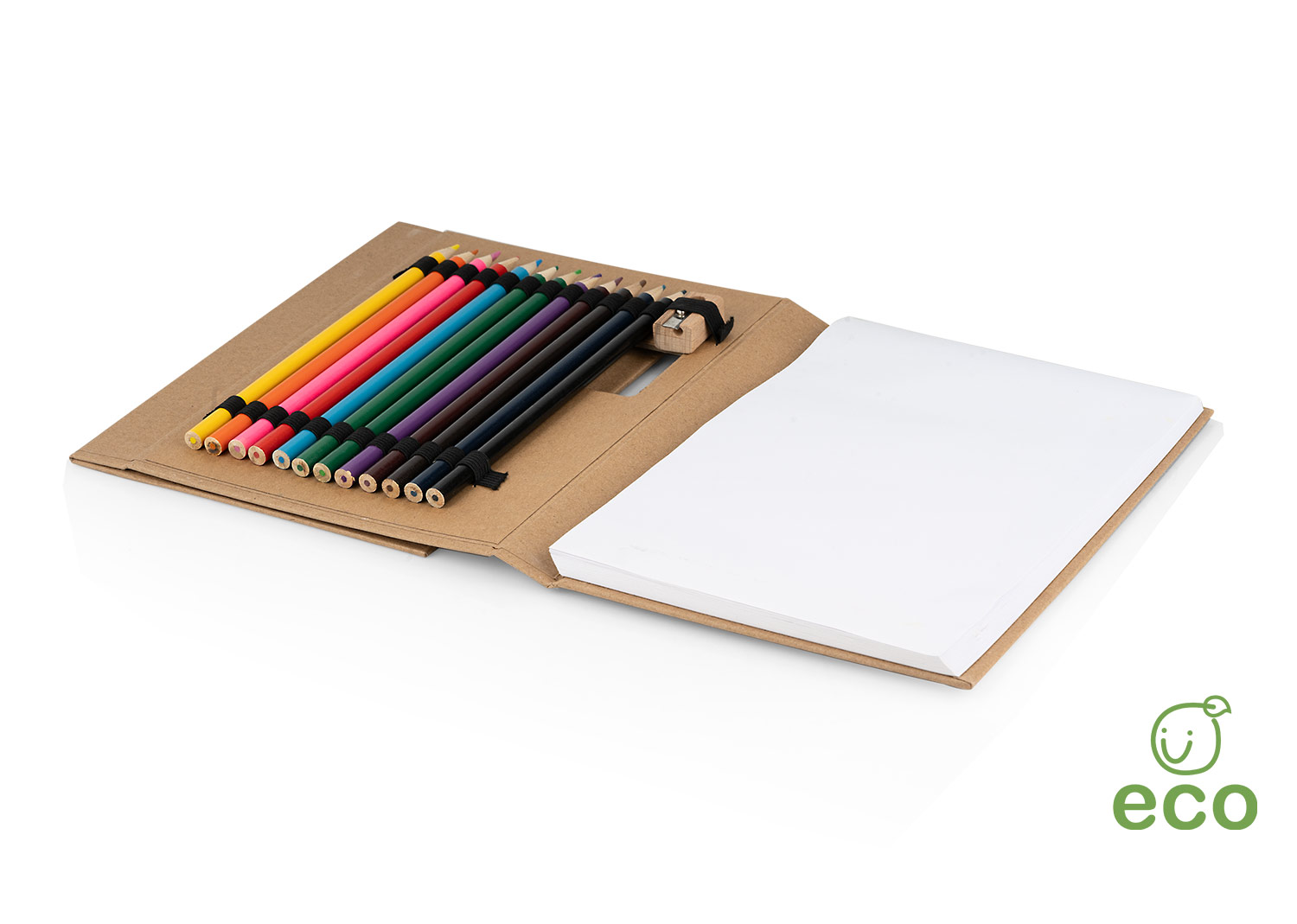 Set de 12 colores y sacapuntas en caja de papel reciclado con banda elástica para asegurar. Contiene un bloc de hojas blancas para dibujar.