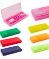 Práctico estuche plástico que contiene 1 una cosedora, ganchos de repuesto x 5, dispensador de cinta adhesiva, rollo de cinta adhesiva de repuesto, clips de colores, saca-ganchos, tijeras, taja-lápiz.