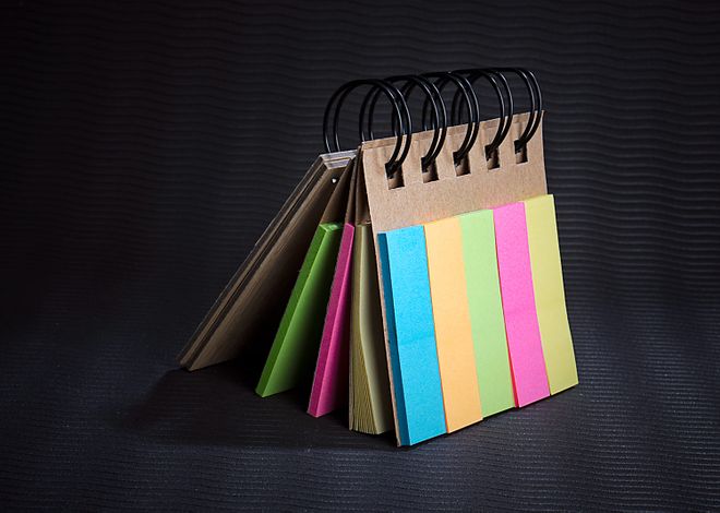 Set de memos con argollado doble O y cubierta en Bambú. 3 set de memos adhesivos por 40 hojas y 5 colores de banderas en papel x 25 unidades cada color.