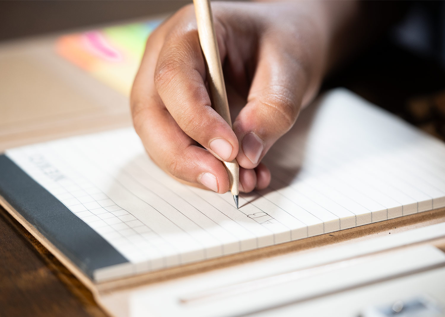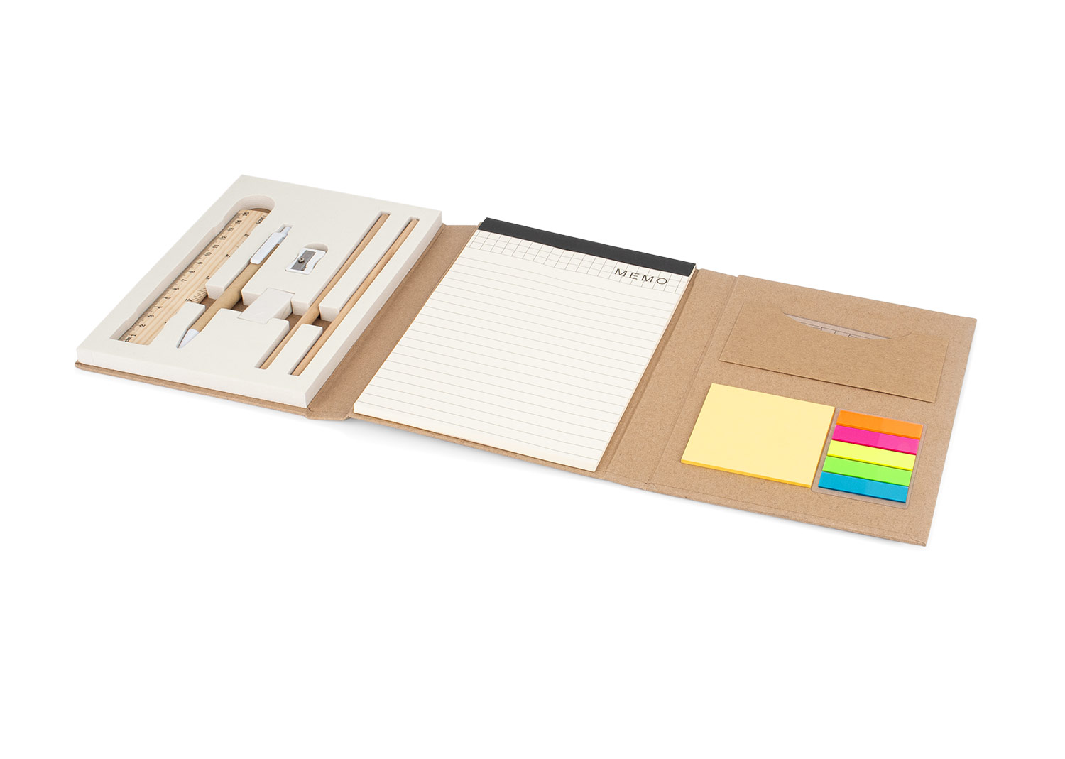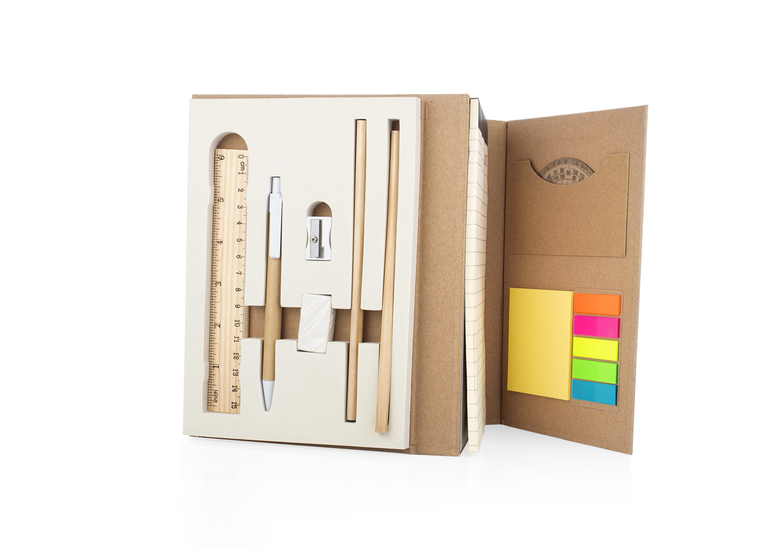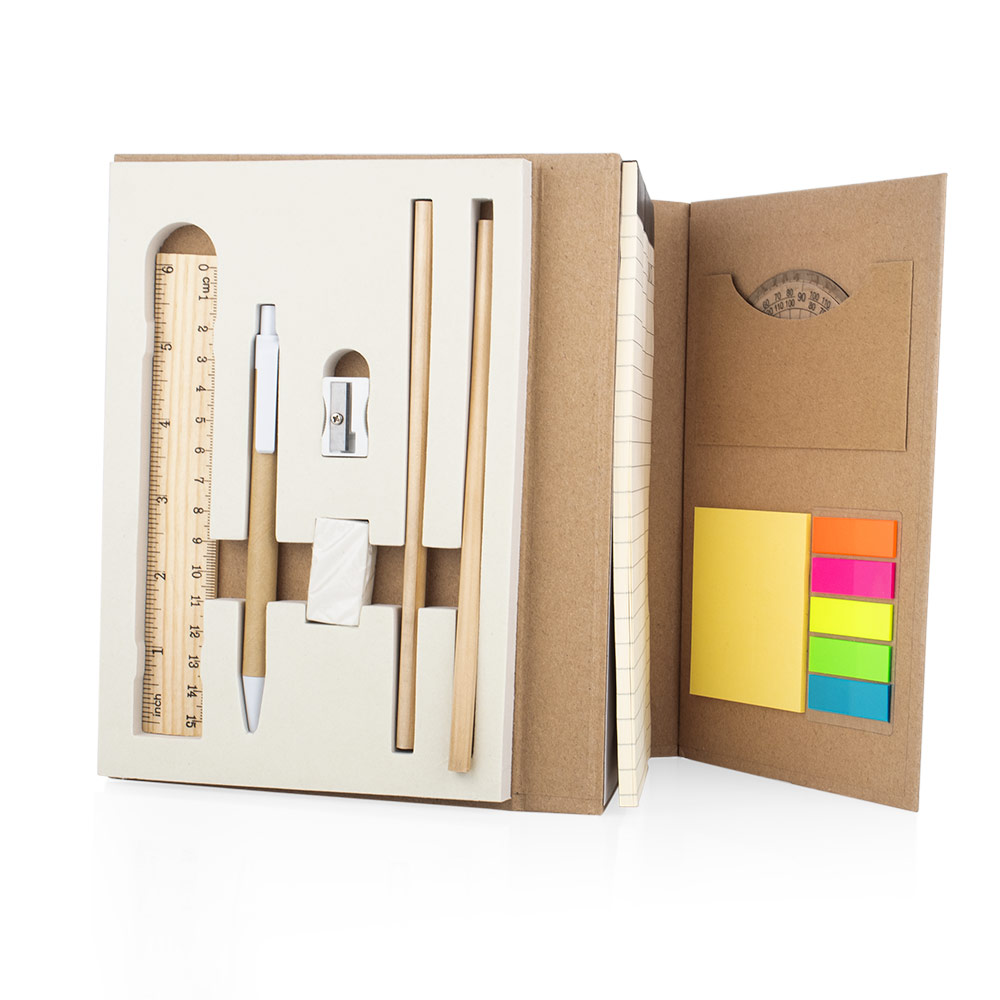 Set de bloc de notas, tapa de cartón, tamaño A5, 80 hojas con pegatinas de colores, regla, bolígrafo, sacapuntas, borrador y lápices.