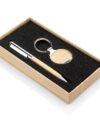 Set ejecutivo, incluye porta tarjetas metalico, llavero metalico rectangular y bolígrafo en Aluminio con sistema twist, todos con acabados en Bambú para la marca en laser, caja de regalo negra