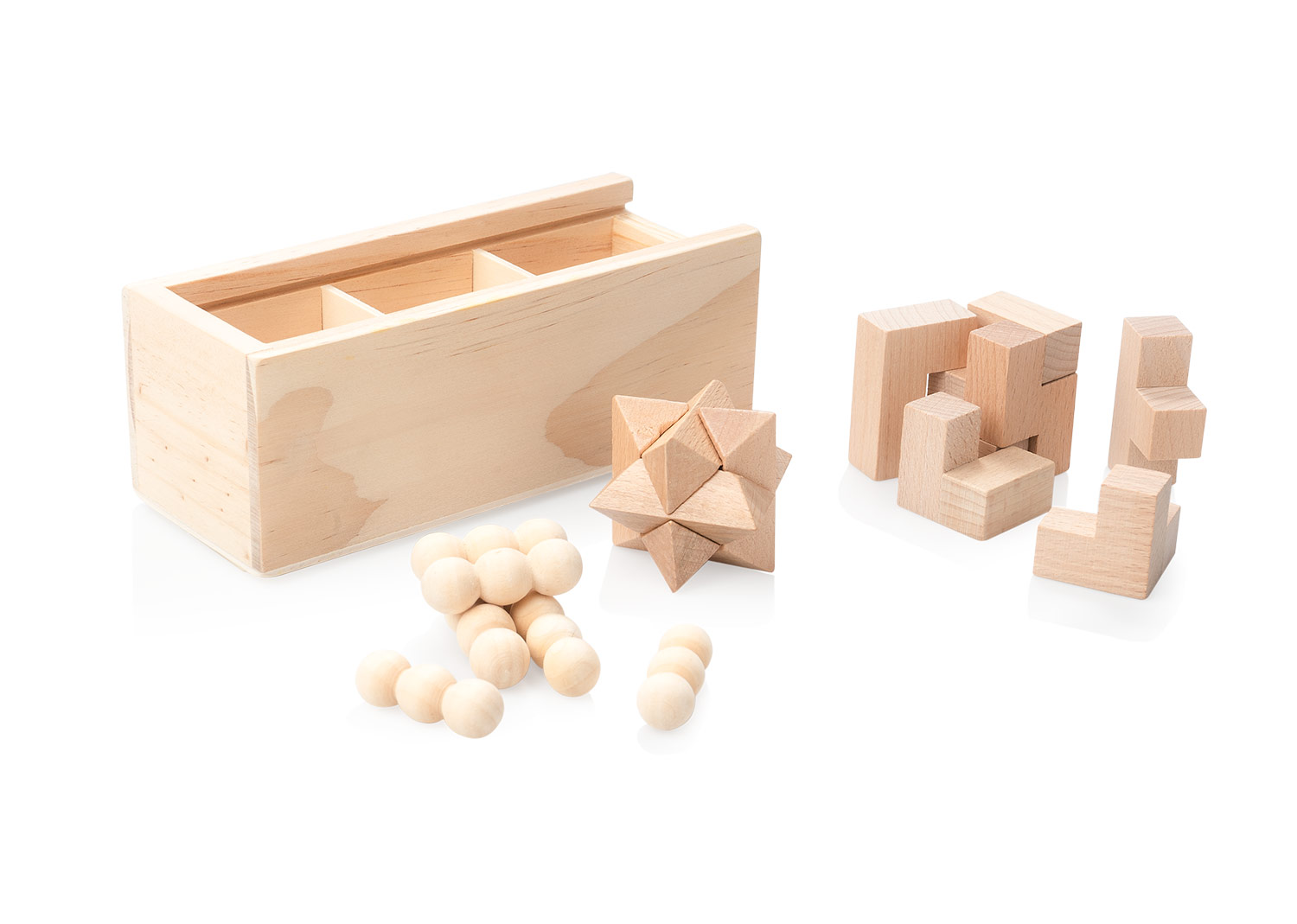Set de madera con 3 juegos de lógica. Incluye rompecabezas 3D para desafiar tu ingenio. Viene en una práctica caja de almacenamiento con tapa deslizante.