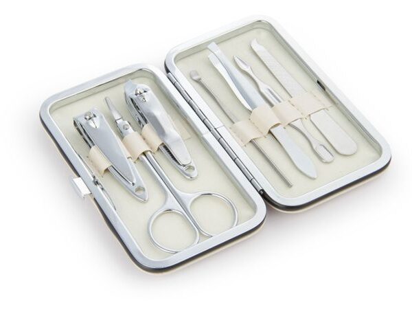 Set de manicure en estuche plástico compacto. Incluye: Cortauñas, tijeras, pinzas y bajacutículas.