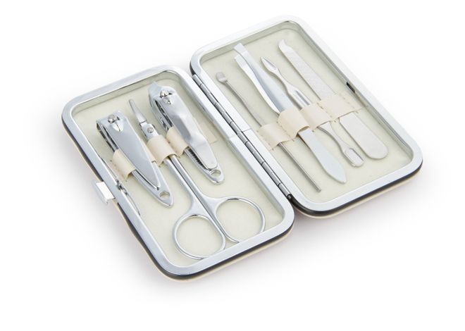 Set de manicure con cierre a presión que incluye: Lima, limpiador, depilador, bajacutículas, 2 cortauñas y tijeras.