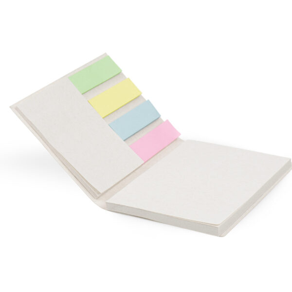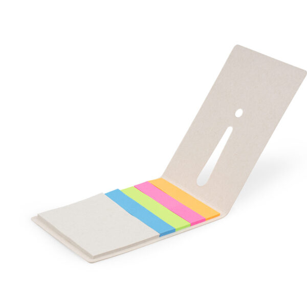 Set de memos elaborados en material recuperado de cajas de leche. Incluye 5 juegos de banderas adhesivas en papel de colores de 25 hojas c/u. Espacio para las tarjetas. Banda elastica en el cierre.