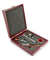 Incluye sacacorchos con navaja y destapador, stopper, arillo, termómetro, cortador y caja de madera con cerrojo tipo hebilla.